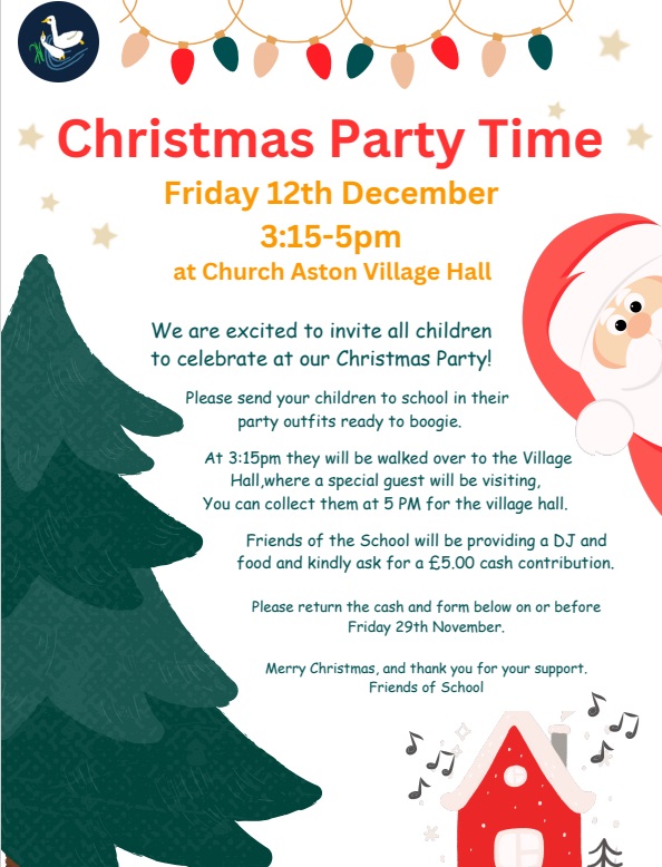 Friday 12th December - Christmas Party 3:15 - 5pm at the Village Hall. The Friends are doing food and will organise activities for the children. Hopefully Santa will visit during the party.